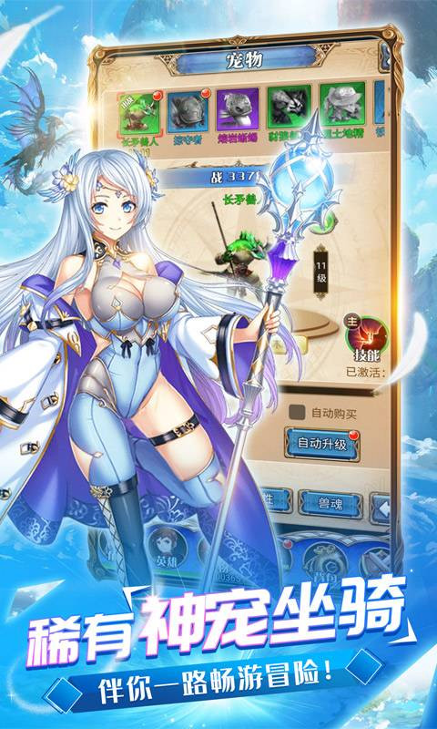游戏简介:《精灵战纪》是一款二次元魔幻风的放置挂机游戏,经典挂机玩法,不氪金不伤肝!玩游戏,VIP就免费送!游戏内有各种炫目技能战斗,还有百款个性时装和专属皮肤,让玩家能随心打造专属个性角色;呆萌酷炫坐骑陪你畅游冒险;游戏有各种酷炫的神宠坐骑、绚丽的翅膀,各种强力的英雄可以帮你勇斗恶兽,招募英雄一同并肩作战;还有跨服大作战,强大世界BOSS刺激玩法。恶龙已经咆哮肆虐,赶紧行动起来吧,未知的世界正等你来探索征服。一句话介绍:奇妙未知的世界在等待着勇士来征服。
