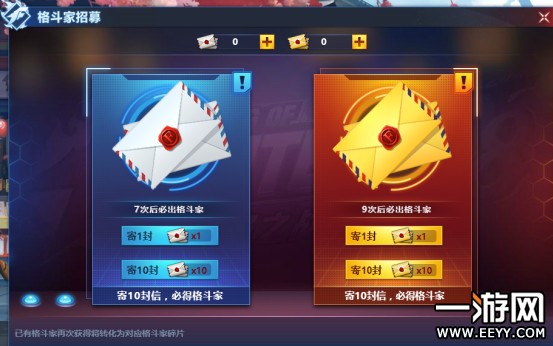 酒馆内分小酌一番及嗨翻全场两种招募方式,小酌一番每10次必得格斗家碎片,嗨翻全场每10次必得2星及以上整个格斗家,当获得已拥有的格斗家时将转换为对应数量的格斗家碎片。(每日还可以获得免费5次小酌一番)