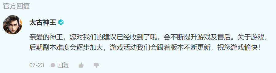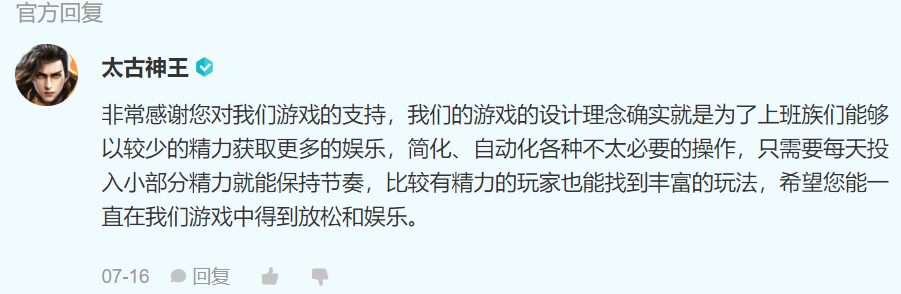 除了上文提及的“挂机收菜”,用户好评中提及最多的是游戏对于碎片化、空闲时间的利用,针对这些评论,官方回复内容也借此强调了游戏的核心基调。这些都在玩家层面保持了良好的互动。