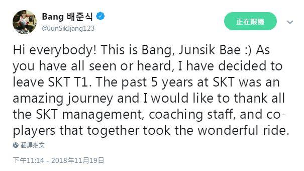 SKT官宣之前,Bang连续发推,回忆自己的SKT征程,感谢队友和教练,并表示自己将开始接触寻找新的队伍: