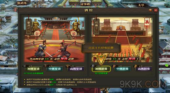 《兵法三国》酒馆系统可分为招募士兵与招募武将,顾名思义就是招募士兵与武将的地方,没个招募可分为初级招募、中级招募和高级招募。每30次高级招募都可以获得神级武将或神级士兵,你还在等什么招募属于自己的武将与士兵吧!