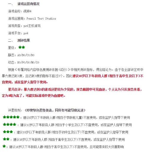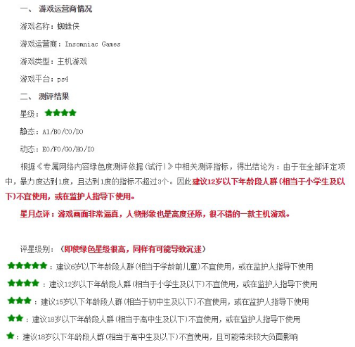 评测显示,《战神》、《逃生2》和《如龙6》的评星级别为2星,建议18岁以下年龄段人群(相当于高中生及以下)不宜使用,或在监护人指导下使用。而《最终幻想15》和《漫威蜘蛛侠》则是4星评级,建议12岁以下年龄段人群(相当于小学生及以下)不宜使用,或在监护人指导下使用。