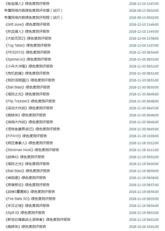从2011年10月开始,中国青少年网络协会在《专属网络内容绿色度测评依据(试行)》基础上,组织包括游戏玩家在内的测评专家对目前热门的网络游戏进行绿色度测评,依据游戏的暴力度、色情度、恐怖度、颓靡度、管理不良度、广告不当度、时间耗费度、恶意PK度、货币消费度等多项指标,出具游戏绿色度测评报告,给出游戏不适宜年龄提示。