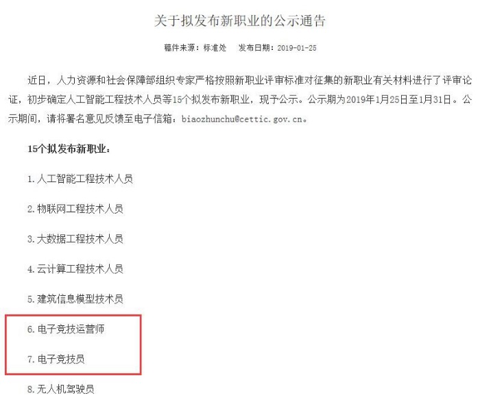 中国就业培训技术指导中心(ETTIC)官网近日公开了一份《关于拟发布新职业的公示通告》,人力资源和社会保障部初步确定了15个拟发布新职业,其中包括了电子竞技运营师和电子竞技员。