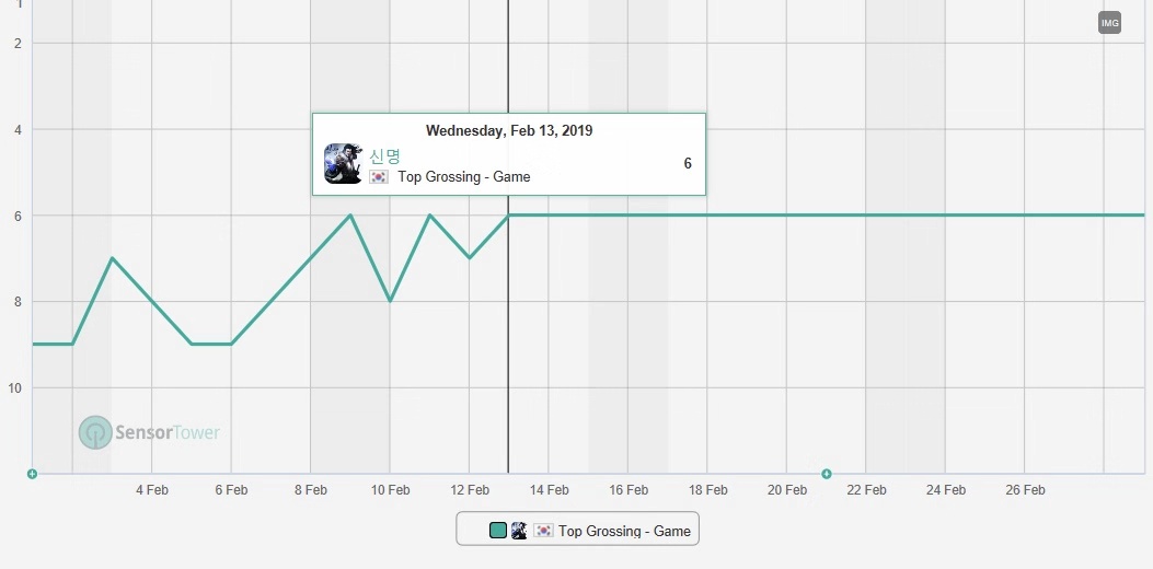 在1月入围榜单后,《神命(??)》的2月营收环比再涨21%,来到22名。2月期间,《神命(??)》发挥稳定,仍保持在韩国畅销榜前十的位置。