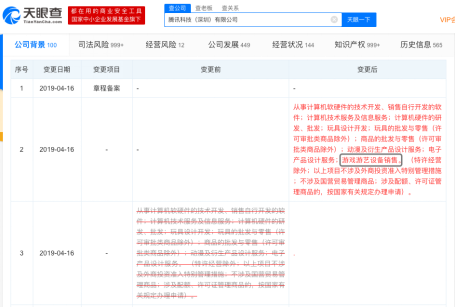 游戏葡萄4月17日消息,天眼查官方显示,腾讯科技(深圳)有限公司经营范围发生变更,新增游戏游艺设备销售业务。