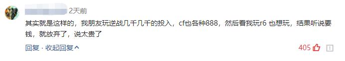 “我朋友玩《逆战》,几千几千的投入,cf也各种888。他看到我玩r6(彩虹六号)也想玩,结果听说要钱,就放弃了,说太贵了……”