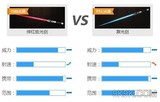 和彩虹激光剑、激光剑相比,绯红极光剑与它们在威力、携带和范围属性上不相上下,而速度上则有占据更好的优势。