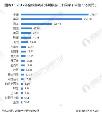 具体国家来看,中国游戏市场以275.47亿美元的规模占据首位,在全球比重达到25.3%;美国游戏市场规模同样超过了200亿美元,排在第二;其他国家规模均在130亿美元以下,与中美两国相差甚远。另外,市场规模前十门槛18.75亿美元,前二十门槛为5.97亿美元。