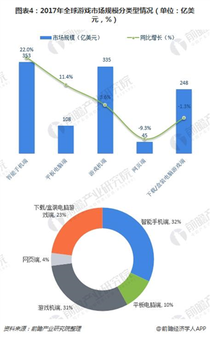 相比移动游戏的快速增长,PC端游戏近年来尽显颓势。2017年,网页端、下载/盒装电脑端游戏市场规模均出现缩水,分别下降9.3%、1.3%。游戏机端相对要好,但增长也低于移动游戏,2017年同比增速为3.6%,市场规模为335亿美元,占比31%。