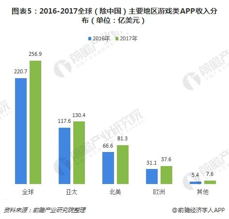 2017年,全球(除中国)游戏类APP收入已超过250亿美元,达到256.9亿美元,同比增长16.4%,增长迅速。其中,亚太地区依然贡献了最多收入,为iOS端和安卓端游戏类APP分别贡献了52.1%和49.2%的收入;其次是北美和欧洲,2017年游戏类APP收入分别达到81.3亿美元、37.6亿美元。