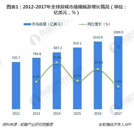 近年来,全球游戏产业保持快速发展,市场规模持续扩张。2012年,全球游戏市场规模还仅为705.7亿美元;到2017年,全球游戏市场规模达到1089.0亿美元,同比增长7.8%,连续两年市场规模在1千亿美元以上。