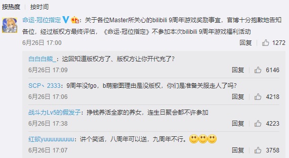 本次B站9周年事件是很好的典型,由于《命运-冠位指定》(Fate/Grand Order,FGO)缺席9周年福利发放活动,玩家间炸开了锅。尽管B站心里也很苦,因为FGO不参与B站9周年奖励发放是应日本版权方的要求,而非B站自己疏忽。