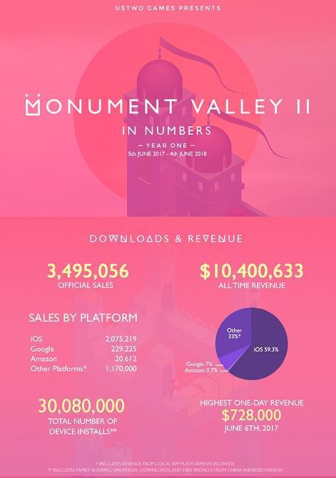 日前,经典益智解谜类手游《纪念碑谷2》的开发商Ustwo Games宣布,《纪念碑谷2》上线一年营收超过1040万美元,累计销量超过350万套,其中iOS用户贡献59.3%,谷歌贡献7%,Amazon贡献0.7%,其他平台贡献33%。