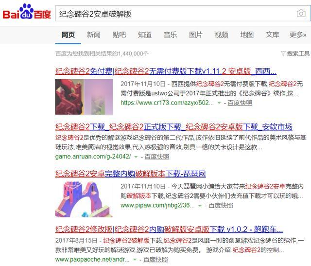 2)盗版破坏行业生态。在百度里输入“纪念碑谷2安卓破解版”,出现的下载结果并不少,搜索“纪念碑谷2 iOS破解版”也有不少搜索结果出现,但绝大部分并不提供iOS版本的下载,是网站站长通过SEO手段让搜索结果里出现相关结果,实际上用户仅能下载安卓版本的破解版。