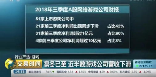 据央视财经频道行业严选·游戏报导,从今年3月以来受游戏版号审批暂停,游戏玩家增速放缓的影响,前三季度国内上市的游戏公司中,42%的公司净利润出现了下滑。