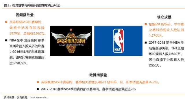 电竞赛事有庞大的粉丝群体,并且用户活跃度较高,以《英雄联盟》为代表的头部游戏赛事,其影响力已经开始赶超传统体育赛事。根据国外直播数据统计机构Esports Charts发布的2018年英雄联盟全球总决赛收视率报告,中国国内有近2亿用户观看了IG对阵FNC的决赛。相较而言,NBA在2017-2018赛季的季后赛阶段,国内直播观看人数仅仅达到2000万人。影响力是赛事商业价值的基础,因此电子竞技赛事的超高影响力有利于其未来的商业化以及提升电子竞技赛事的市场规模。