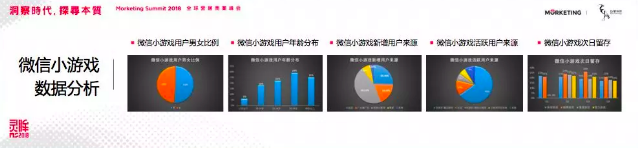 分享一组基于微信的数据。首先,微信小游戏用户男女比例比较平衡,相对于传统的手游或者是端游、页游时代,小游戏用户的比例健康且良性。其实在小游戏之前,游戏的男女比例用户非常失调,这会导致游戏本身产生极端的偏向性。