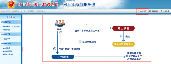 登陆后,页面跳转到名称预先核准的申请页面,点击页面右上角的“申请流程”,即可显示外网申请名称预先核准业务的整体流程,如下图: