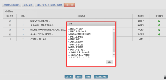 名称相关信息登记完毕后,可点击【校验】按钮对所填写的必填数据或其他相关限制进行校验,如果有未填写的必填项目或不符合要求的填写项目,系统会给出相关提示,如下图。