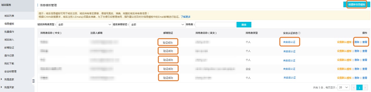 信息模板创建完成后需完成邮箱认证,否则无法在域名注册过程中使用此模板。