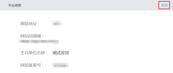 应用详情页面可点击“修改”来编辑应用“基本信息”和“平台信息”。