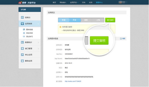 在“管理中心”可查看应用信息。App Key是应用唯一的识别标志,微博开放平台通过App Key鉴别应用的身份。App Secret是给应用分配的密钥,你需要妥善保存这个密钥,从而保证应用来源的的可靠性,防止被伪造。你可通过这两个数据进行相关的技术开发工作。