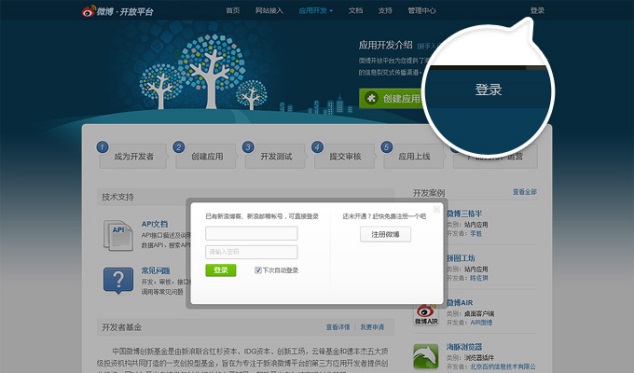 在开发者页面点击“登录”或者“创建应用”,通过帐号登录成为一名开发者。一个微博帐号可以管理10个不同的应用,建议开发人员使用官方微博的帐号,以便统一管理。