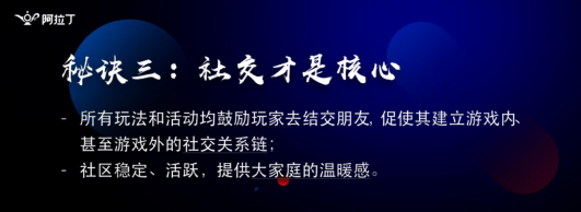 在我们产品中我们设计了很多关于群组的玩法,我们有海盗团队的任务,需要好友一起完成,包括海盗的CP系统,可以在游戏里面找到一个异姓的小伙伴跟你一起互相得到保护,互送游戏中的道具。包括游戏社区,社区内我们也强化运营在微信内把一些游戏中的好友转化为微信好友,这些手段都是有效的能够帮助我们的游戏运营人员提升游戏的核心产品数据。