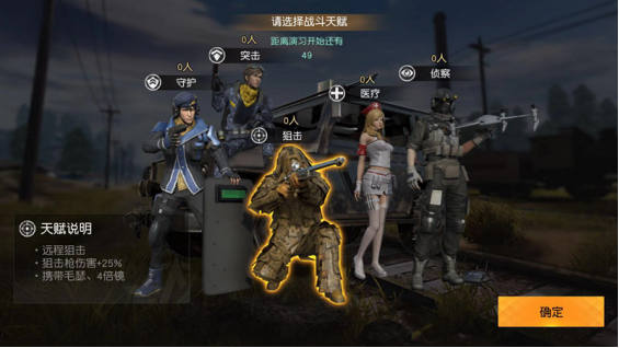 此外,“协同作战”玩法也是品类融合的代表。几名玩家进入小队后,可在战前选择不同的天赋(侦查、医疗、突击、狙击、守护),进入游戏后,根据选择会具备相应的技能。如下图所示,狙击天赋会给玩家配备一把毛瑟和4倍镜,伤害还会提升25%。从某种程度上,它和MOBA中的符文、召唤师技能有相似之处,但也形成了自己的特色。