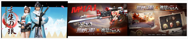 在这两点之外,《荒野行动》日服运营同样不可忽视。他们曾组织过一系列的跨界联动,上线武士皮肤“壬生之狼”,推出《进击的巨人》M4A1枪械联动皮肤以及限定服装: