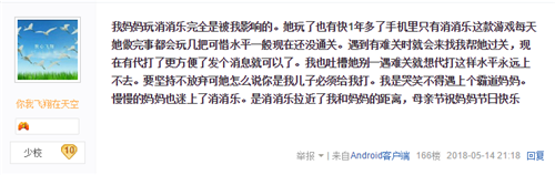 今年开年,“雪姨”发了一条微博感叹中年妇女不适合玩《王者荣耀》、《LOL》,的确,在她们看来她们适应不了大火的MOBA游戏,有时看孩子们玩这类游戏,还是觉得场面过于“刺激”。虽说如此,妈妈们也是会喜欢消除游戏带来的挑战性的,“以前玩过斗地主,觉得没有趣,感觉节奏太慢了,而且每次玩法都差不多”。消消乐的研发团队持续研发新元素、新关卡,不断有新鲜的游戏玩法加进来,平均每18天更新约15个新关卡、每 45 关为玩家提供一种新游戏元素,所以在玩法上又比其他的休闲游戏要都多。这种更新满足了大多数妈妈寻求挑战的心理,许多妈妈是更新多少关就通多少关。