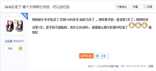 通过在《开心消消乐》贴吧的观察,贴吧里关于妈妈的话题主要有以下三种: