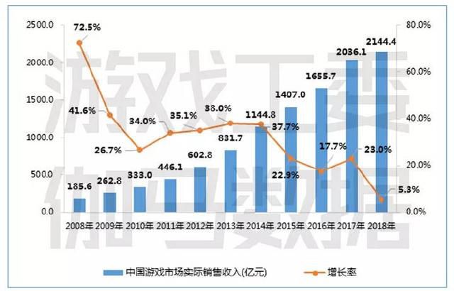 近些年来,中国游戏产业已经牢牢占据世界第一的位置。根据《2018年中国游戏产业报告》显示,今年中国游戏市场实际销售收入共2144.4亿元,但整体收入的增幅明显放缓,同比增长仅为5.3%。