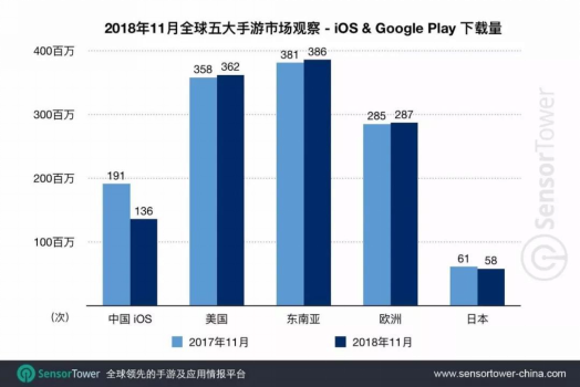 而纵观全球五大移动互联网市场,上升势头最猛的莫过于东南亚市场。在Sensor Tower发布了2018年11月全球五大移动游戏市场趋势报告中,东南亚六国(越南、泰国、新加坡、印尼、马来西亚、菲律宾)合计贡献3.8亿次下载,位列五大市场第一。