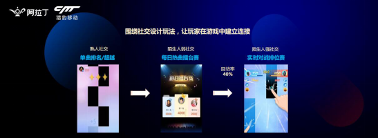 具体举个钢琴块的例子,首先是熟人社交上,我们会做一些玩家之间、好友之间的比分的PK和排名,在游戏中会做一些超越类的玩法。这种互动方式比较好的刺激玩家互相分享,这种方式非常关键的获取新用户的方式,但是熟人社交有个非常大的问题比较难持续,比如好友间游戏进度是不太一样的,可能水平差距很大,在这种基础上,我们后面推出了陌生人社交玩法,比如每日擂台赛,实时对战的排位赛,通过游戏中陌生人社交的玩法,我们比较好的满足了沉淀下来的核心玩家的诉求。通过这种方式形成了比较好的社交互动闭环,通过熟人好友的社交获取新用户,再把新用户通过游戏内社交玩法把他们沉淀下来。