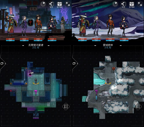 游玩过程中,手机屏幕被分成了两个大小不等的区域,下方较大的部分作为地图(进入战斗会变成敌人一方的画面),上方较小的部分则是玩家队伍的特写,默认点击屏幕即可移动小队进行冒险。
