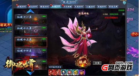 在《御魂九霄》的激战BOSS界面中,玩家可以找到仙域BOSS的入口,仙域共有十五层,每一层都有一个BOSS镇守。想要进入仙域,需要满足每一层的仙职需求。