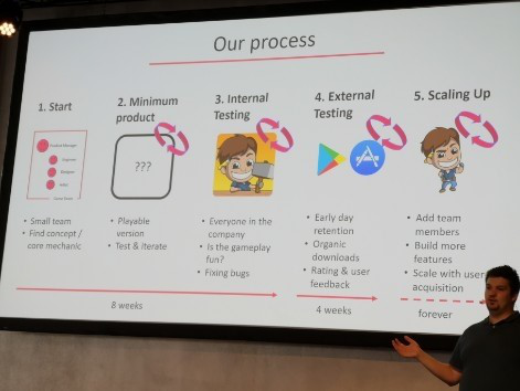 我们给最小化可用产品的时间限制是8周,第四个环节是做外部测试,我们会把游戏在特定地区测试,看这个玩法是否有人注意,下载量表现怎么样,也就是测试游戏玩法是否有市场需求。当然,我们也会看玩家评论和评分,毕竟我们做游戏是给玩家体验的,而不只是我们自己,这时候我们会进一步发现更多的问题并给出解决方案。
