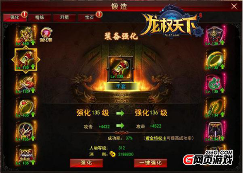 相信每位玩家都和我一样,刚进驻一款游戏,自然是要寻找提升实力的方法,在这里,《龙权天下》的锻造系统便是你的好去处,锻造系统可对自身的装备进行锻造,包括:强化、精炼、升星、宝石,这四个功能,丰富多样的玩点,为游戏增加了许多趣味性。