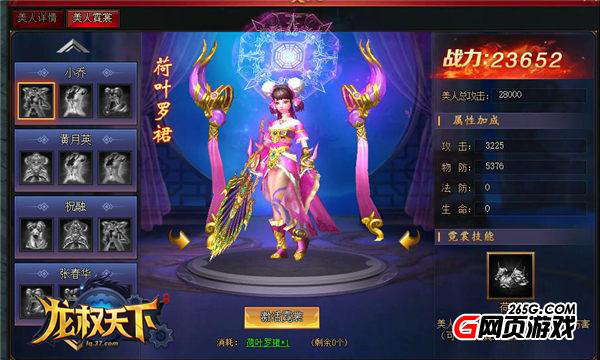 孤身一人战斗,久而久之,难免觉得寂寞,贴心的37《龙权天下》美人系统将安排美人与你一起并肩作战,可别以为美人只是花瓶的存在哦!玩家可对美人进行升阶,提升攻击、物防、法防、生命等各项属性,提升战力,战斗中为你横扫全场!