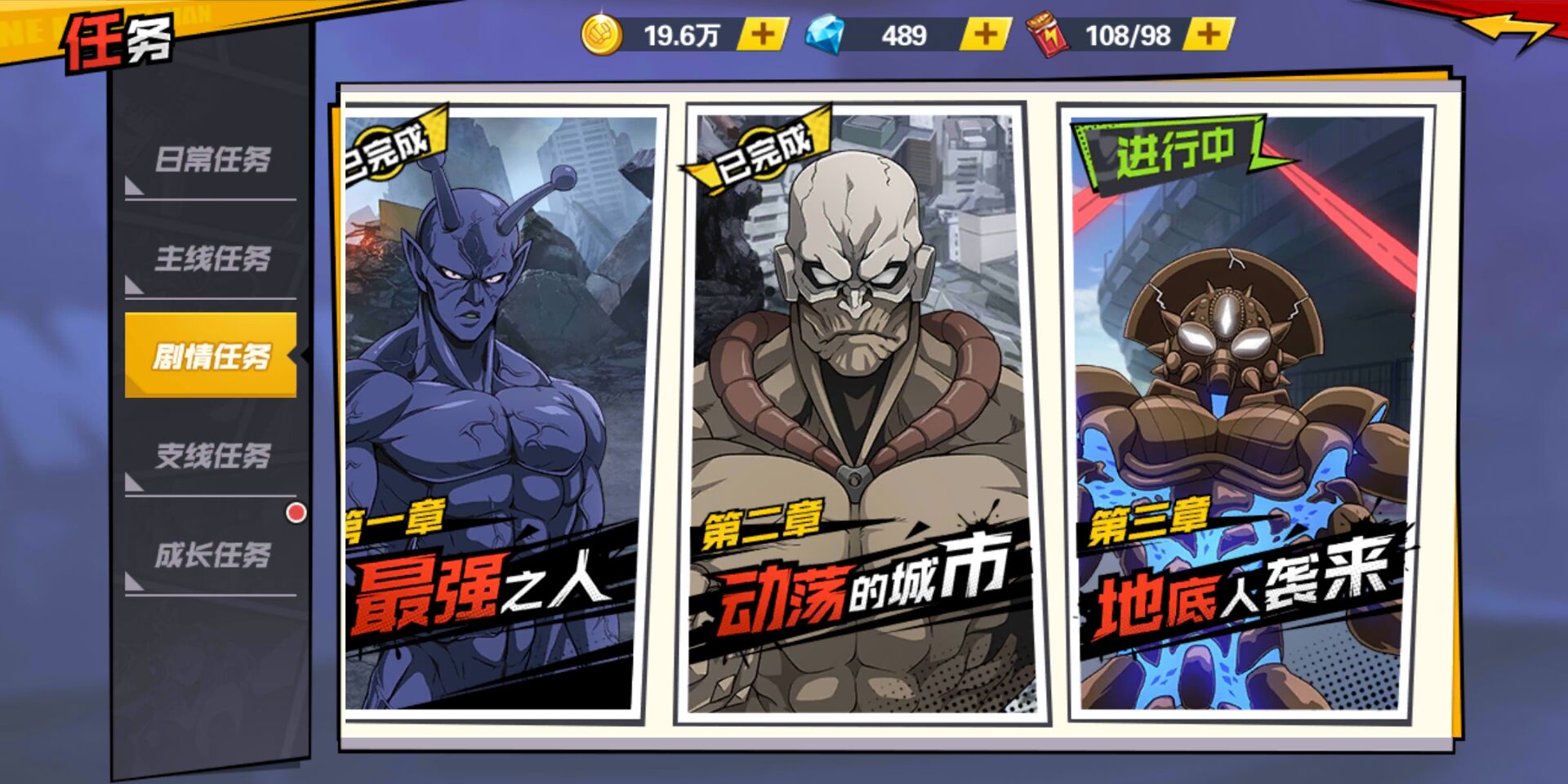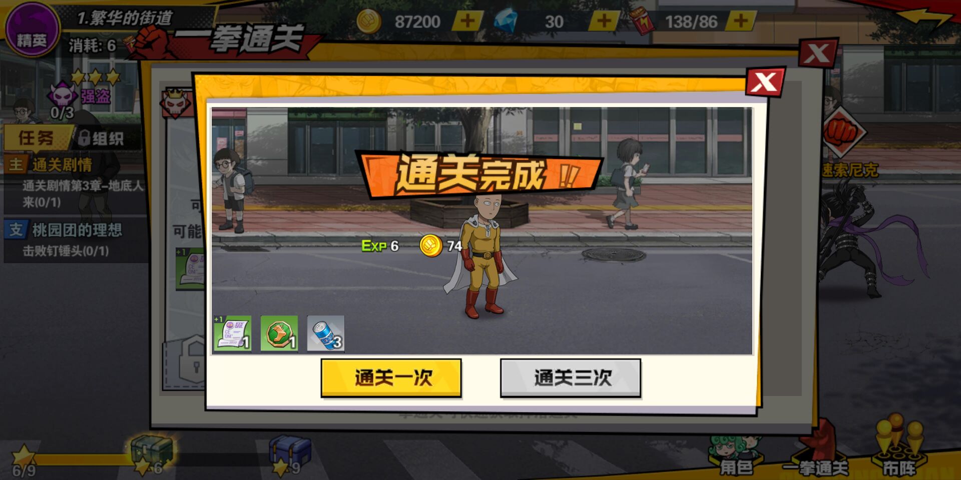 还有一个比较有意思的细节,是扫荡系统,在这款游戏里被称作了“一拳通关”,三星过关以后即可使用。虽然游戏中并不能提供一个秒天秒地的埼玉老师给玩家,但是从侧面还是展现了一些原来的味道。