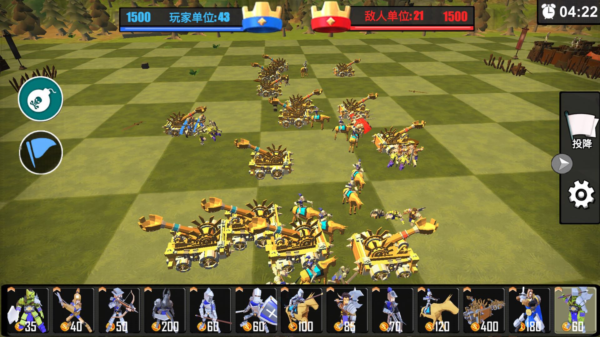 游戏内有十余种的兵种可供选择,如步兵、弓兵、盾兵、骑兵等,另外还包含了炮车等攻城道具。此外,玩家每隔一段时间还会收集一枚手雷(按键位于屏幕左侧),用来制造范围性的爆发伤害。而除了上述提到的内容,游戏几乎再没有什么高阶操作了。