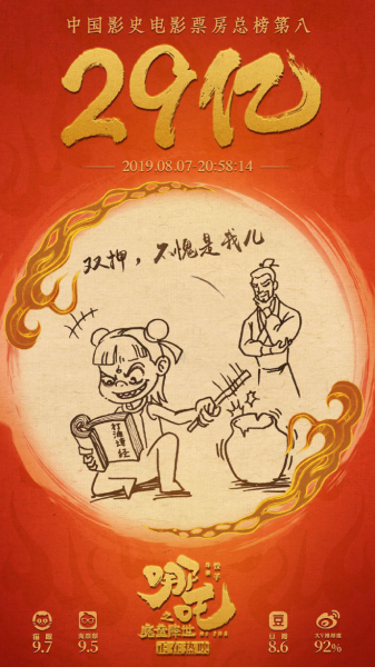 《哪吒之魔童降世》票房超29亿,官方再发庆祝海报,从票房走势来看,《哪吒》今日即将破30亿元大关,有望超越《我不是药神》。