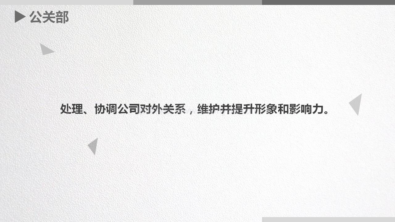 处理、协调公司对外关系,比如节假日的关怀,跟政府部门或者上下游厂商的关系拉近,如果有玩家或者竞争对手媒体抹黑你、雇水军、撬客户、砸牌子,这时就需要公关部门出来,危机公关、 维护形象、 提升影响力、参加一些展会,包括谈合作时关系要跟上。什么样的公关部门是一个好的部门呢,就是整天无所事事的公关部门,这一点大家可以好好想想。