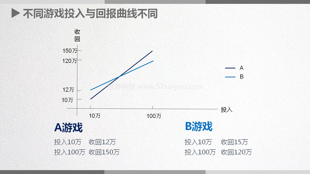 比说A游戏,投入10万收回12万,投入100万收回150万,