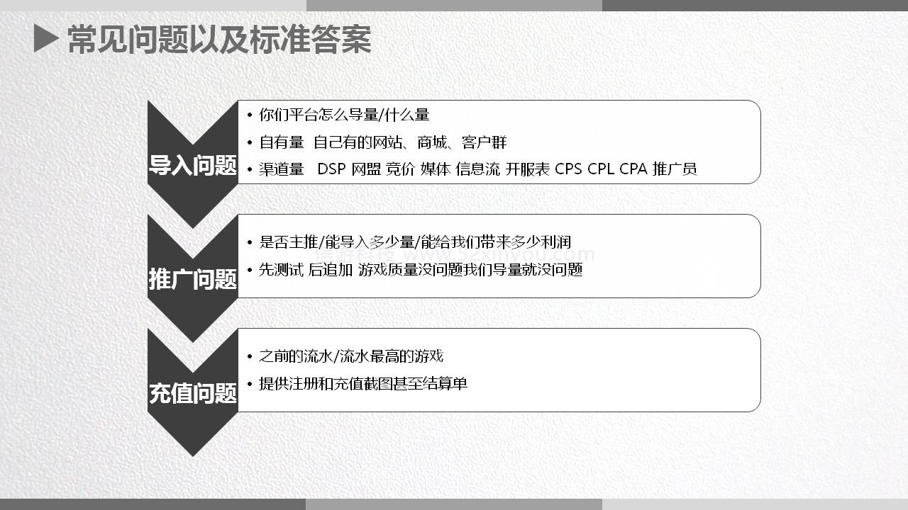 2.推广问题:发行会问你我家游戏是不是主推,比如导1000万的量多少分给我家游戏啊,他不会直说,但是潜台词就是这个意思,咱们不可以直接拍胸脯保证。就说我们会先测试测试,只要你的游戏没问题我们导量就没问题,给自己留点退路。