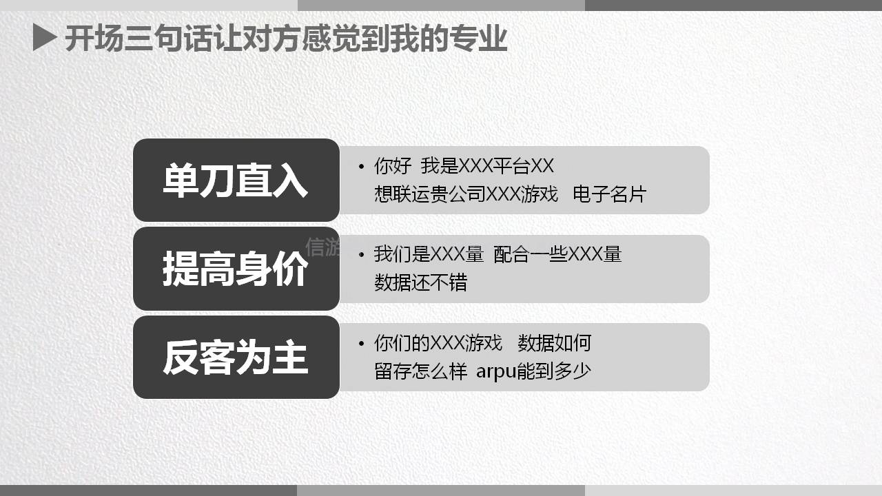 3.反客为主:刚开始他都会问平台主打什么游戏 ,留存怎么样 ,流水怎么样各种各样的问题。你也问一下他,你问问他你们的游戏 数据怎么样啊, 留存多少啊 ,arpu值是多少呀,这样他会觉得你比较专业,对接起来就比较对等。