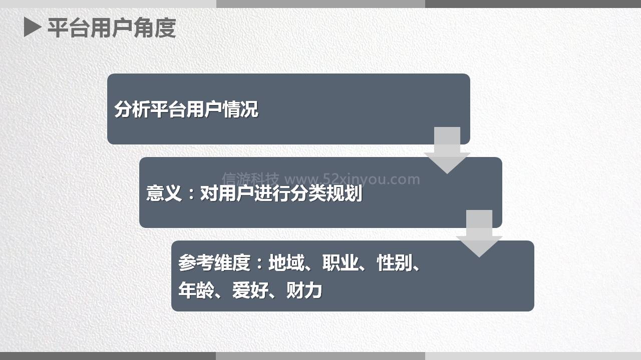 从平台用户的角度来看,分析平台用户的地域、职业 、爱好 、性别 、财力等等,给用户进行分类规划,后面会详细介绍为什么要给用户分类。